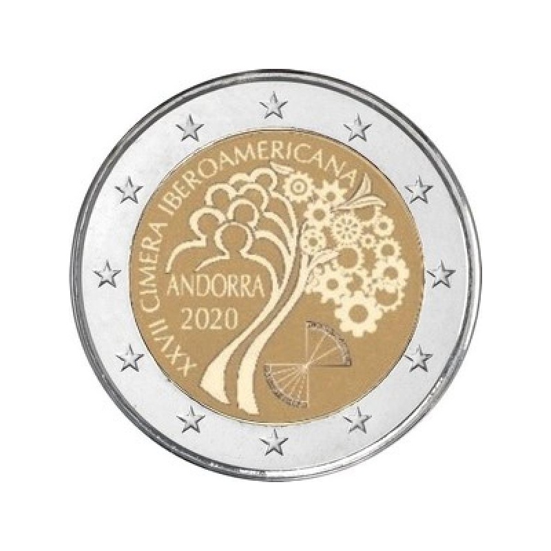 Kirjeldus: 27. Ibero-Ameerika riigipeade ja valitsusjuhtide tippkohtumine peetakse 2020. aastal Andorra Vürstiriigis. Andorra, mis on Ibero-Ameerika konverentsi uusim ja kõige väikseim liige, on selle kõrgetasemelise poliitilise kohtumise korraldaja. Kohtumisel osalevad 19 Ladina-Ameerika riiki ning Hispaania, Portugal ja Andorra. Kohtimisel arutatakse ühiste eesmärkide (nt kestlik areng) saavutamist. Mündil on kujutatud puu, mis koosneb inimsiluettidest ja tillukestest hammasratastest. Inimsiluetid sümboliseerivad ühiskonna lõimumist, kultuuri ja haridust kestliku tuleviku saavutamiseks. Tillukesed hammasrattad sümboliseerivad tippkohtumisel osalejate ideede ja ettepanekute vahetamisest tekkivat sünergiat. Puu kõrval on kujutatud 27. tippkohtumise logo. Logo ülemisel poolel kujutatud kolm kolmnurka sümboliseerivad Andorra lipu värve. Logo alumisel poolel kujutatud kuus kolmnurka sümboliseerivad Andorra avatust kestliku arengu eesmärkidele. Kujutise ümber on kiri „XXVII CIMERA IBEROAMERICANA ANDORRA 2020” (27. Ibero-Ameerika tippkohtumine, Andorra 2020). Mündi välisringil on kujutatud Euroopa Liidu lipu 12 tähte.