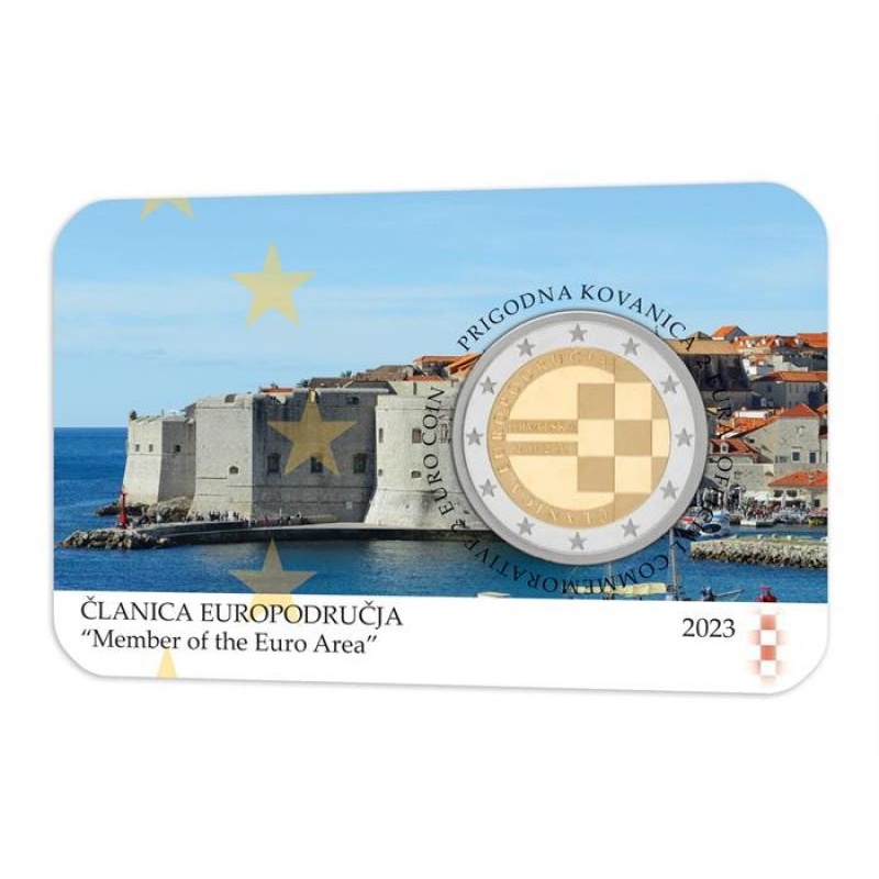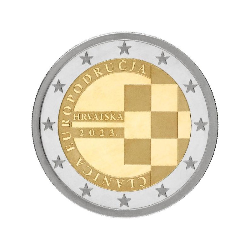 Description: The design features the inscriptions of the issuing country ‘HRVATSKA’ (Croatia) and the year of issuance ‘2023.’, depicted horizontally, as well as the words ‘ČLANICA EUROPODRUČJA’ (member of the euro area), which are inscribed along the outer edge of the coin’s core. These inscriptions symbolically form a stylised symbol of the euro ‘€’. The other central motive of the coin is Croatia's distinctive and recognisable symbol, the Croatian checkerboard, which represents part of the coat of arms of the Republic of Croatia. The coin’s outer ring bears the 12 stars of the European flag.