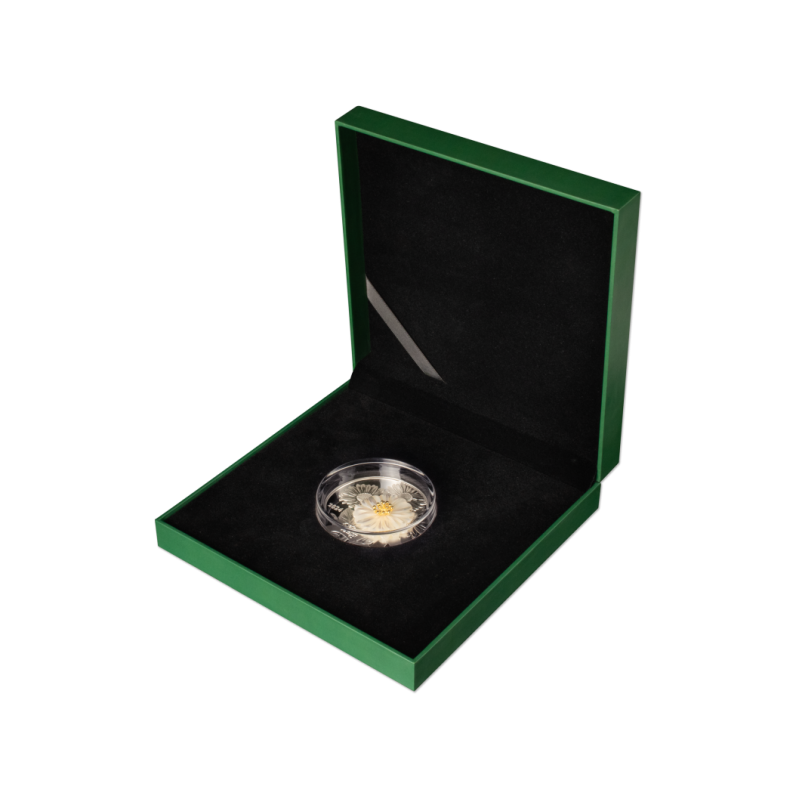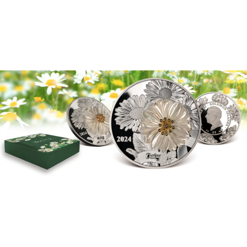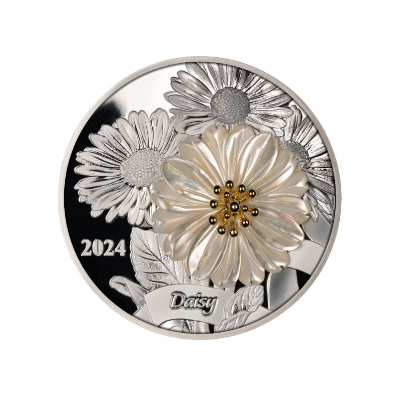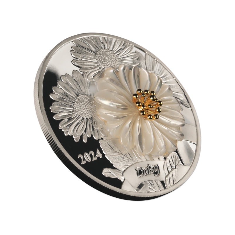 This 2 oz pure Silver coin features a stunning 3D daisy flower made of natural white Mother of Pearl, complemented by a floral core of Gold plated brass.