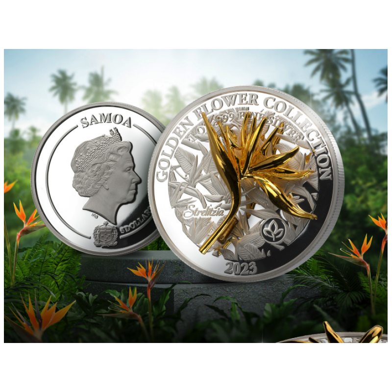 Golden Flower Collection - Strelitzia. Samoa 5$ 2023 99,9% Silver Coin with 3D Golden Flower. 1 oz.