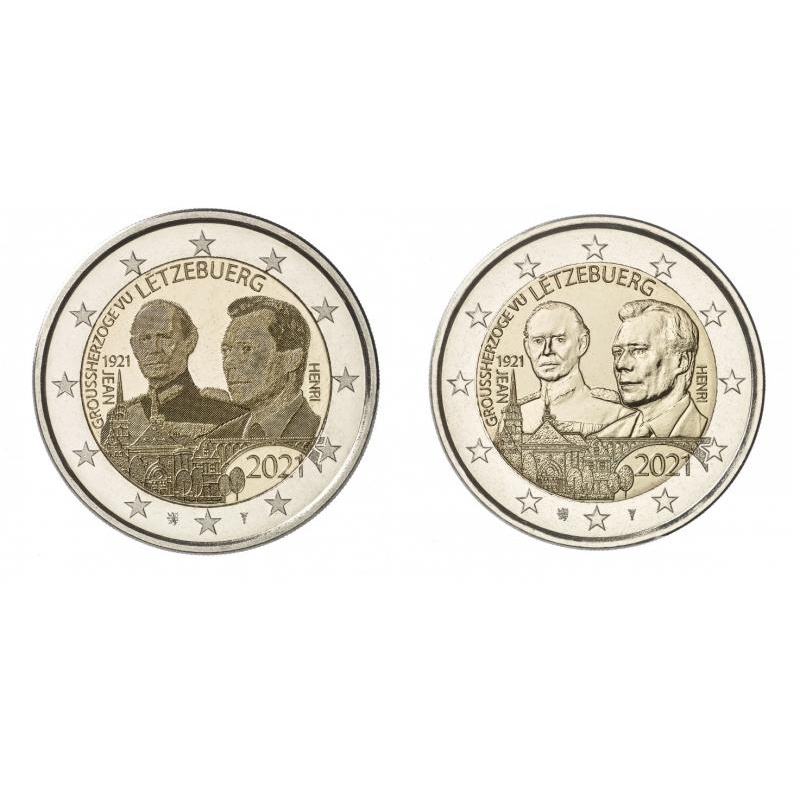 Description: The design depicts on the left hand side the effigy of the Grand Duke Jean and on the right hand side the effigy of the Grand Duke Henri. Close to each effigy, the respective name of the Grand Duke is specified, as well as the year of birth ‘1921’ of the Grand Duke Jean. Below the effigies, an outline of Luxembourg city is represented. At the left, the text ‘GROUSSHERZOGE VU LËTZEBUERG’ designating also the issuing country is depicted in circular form. The year-date ‘2021’ is shown at the bottom right. The coin’s outer ring bears the 12 stars of the European flag.