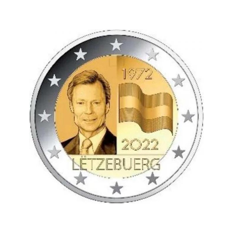 Description: : The design depicts at the left hand the effigy of the Grand Duke Henri and at the right hand the Luxembourg tricolor flag. The year ‘1972’ appears above the flag and the issuing year ‘2022’ is depicted below. At the bottom centre the name of the issuing country ‘LËTZEBUERG’ is represented. The coin’s outer ring bears the 12 stars of the European flag.