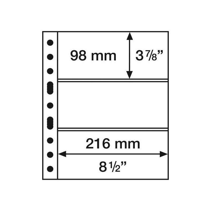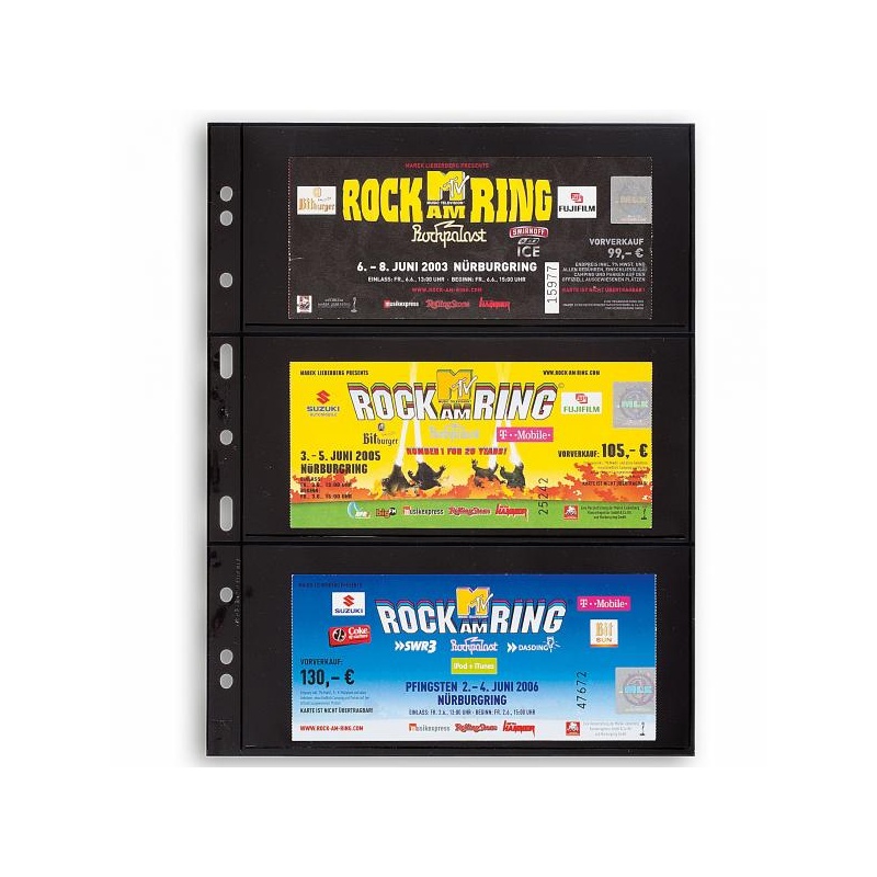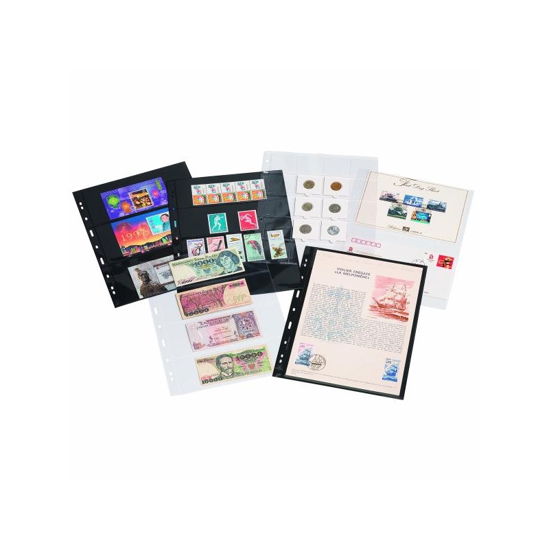 Clear welded strips completely cover the inserted collection items, thereby offering optimum protection. Document quality: 100% free from chemical softeners and acids. 8-cm perforation. The clear C sheets allow one-sided storage, the double-sided black S sheets provide double capacity.