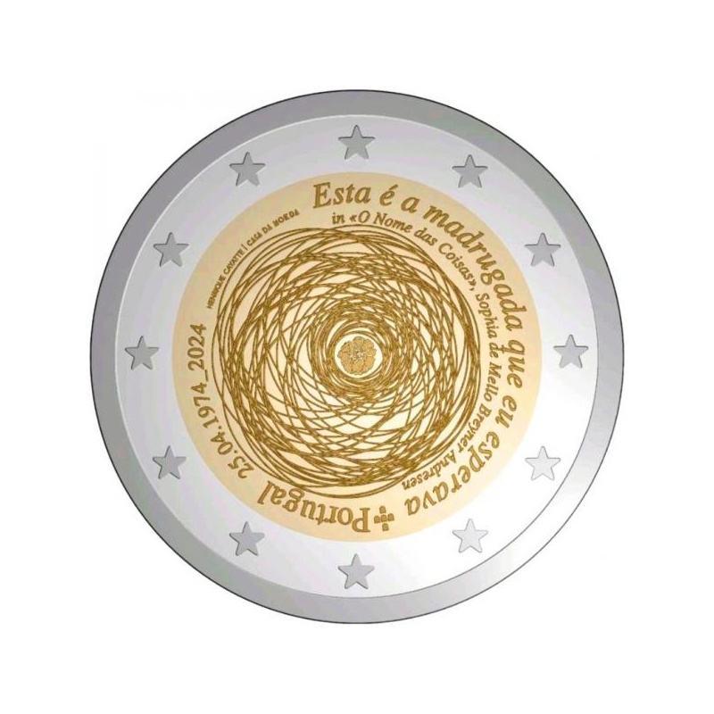 Description: The 25th of April 1974 is the date of the revolution that marked the establishment of the democratic rule in Portugal and the beginning of a journey of profound economic, social and cultural transformations that led to the Europeanization of the country. At the centre of the design, a carnation symbolizes the revolution, surrounded by multiple eccentric circles that suggest that people’s actions and beliefs may change over the years, but remain essentially true to the principles of the revolution. On the edge, on the right, the verse ‘Esta é a madrugada que eu esperava’ [This is the dawn I have been waiting for], and the name of its author, poet ‘Sophia de Mello Breyner Andresen’; and on the left by the national coat of arms, the captions ‘Portugal’ and ‘25 April 1974_2024’, followed by the name of the designer and the mintmark ‘Casa da Moeda’, the name of the Portuguese Mint. The coin’s outer ring bears the 12 stars of the European flag.