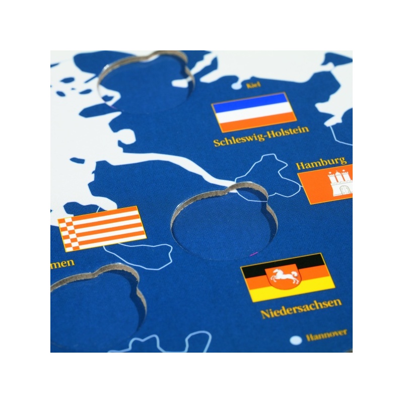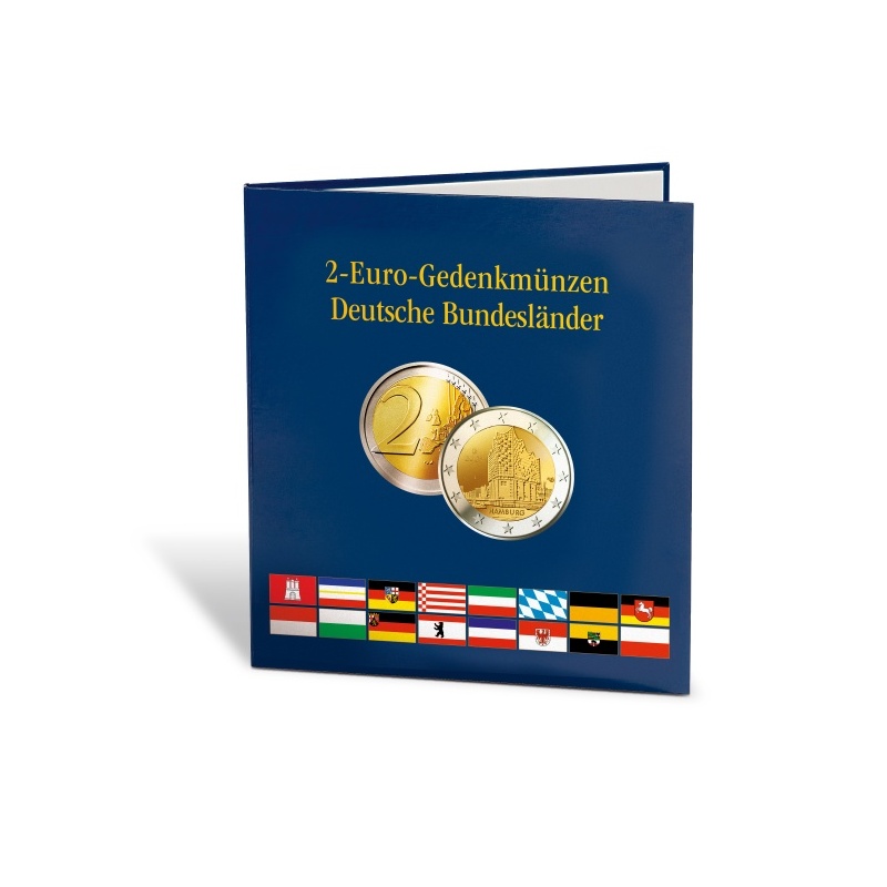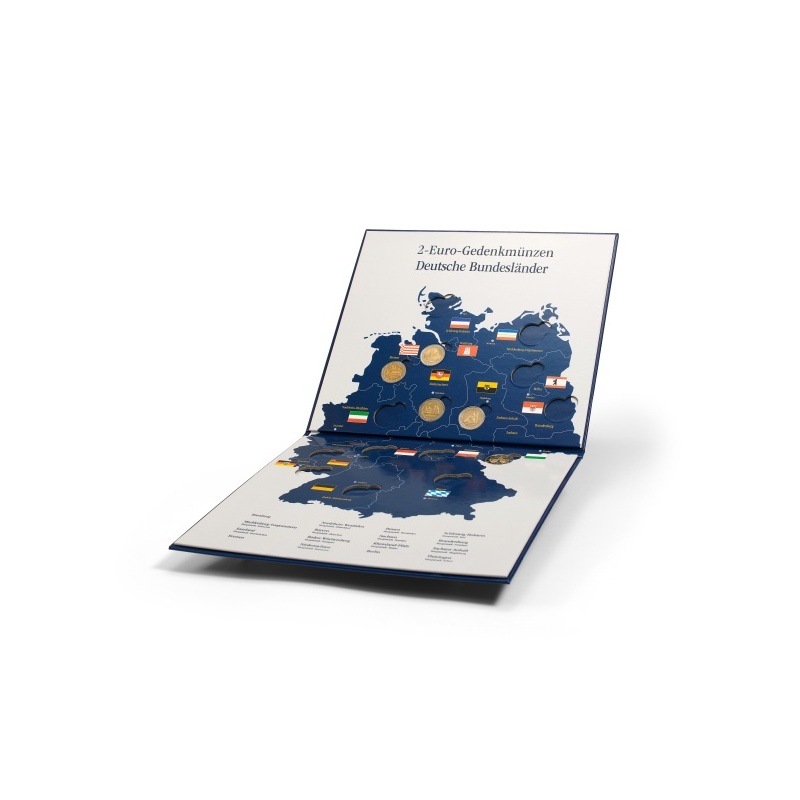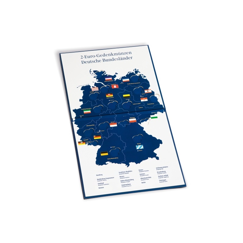 Album contains 16 ports to hold 2-euro commemorative coins from the first or second “German Federal States” series. The premium, printed card features a map of Germany with cut-outs for 16 coins from all German states.