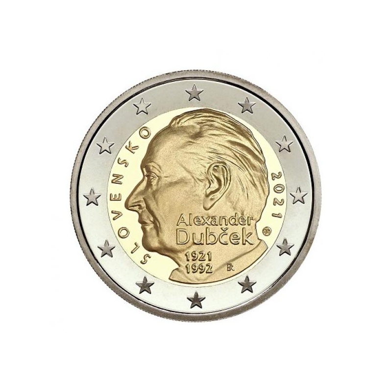 Description: The design depicts a left-profile portrait of Alexander Dubček, a leading Slovak politician whose attempt to introduce liberal reforms in Czechoslovakia in 1968 became known as the Prague Spring. Inscribed along the left edge of the coin’s inner circle is the name of the issuing country ‘SLOVENSKO’. Overlying the lower part of the portrait is the name ‘Alexander Dubček’, first name above surname, and below it are the dates of his birth ‘1921’ and death ‘1992’, one above the other. At the right edge is the year of issuance ‘2021’, and below it is the mint mark of the Kremnica Mint (Mincovňa Kremnica), consisting of the letters ‘MK’ placed between two dies. Next to the bottom right edge are the stylised initials ‘BR’, referring to the national side’s designer Branislav Ronai. The coin’s outer ring bears the 12 stars of the European flag.