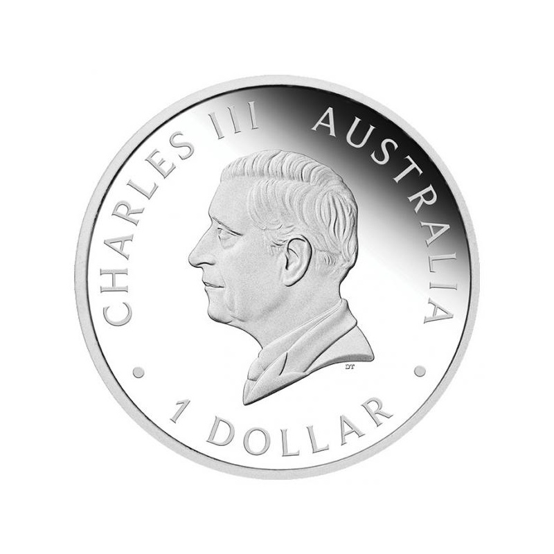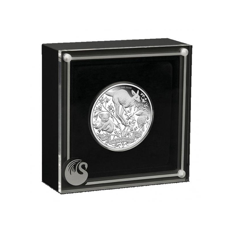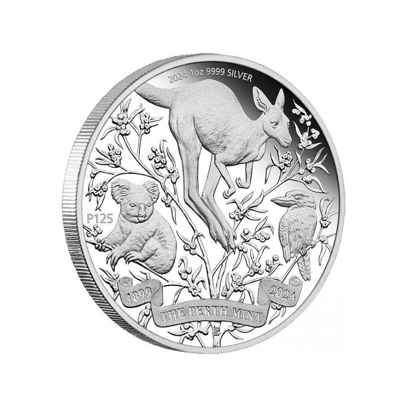 Reflecting its best-known contemporary coin series, the piece portrays a kangaroo, kookaburra, and koala artistically arranged among a representation of golden wattle, Australia’s national floral emblem. The inscription ‘1899 THE PERTH MINT 2024’ appears in a scroll at the foot of the design. Also included are a ‘P125’ mintmark and the coin’s weight, purity, and year-date.