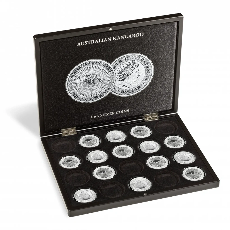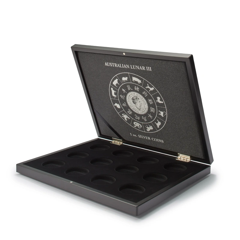 This premium, elegant coin case can store 12 Australian Lunar coins (1 oz.) in original capsules. Noble silver-coloured lid and cushion print. Lid cushion upholstered in black satin. Secure and unobtrusive magnetic closure. Outer format: 305 x 245 x 30 mm.