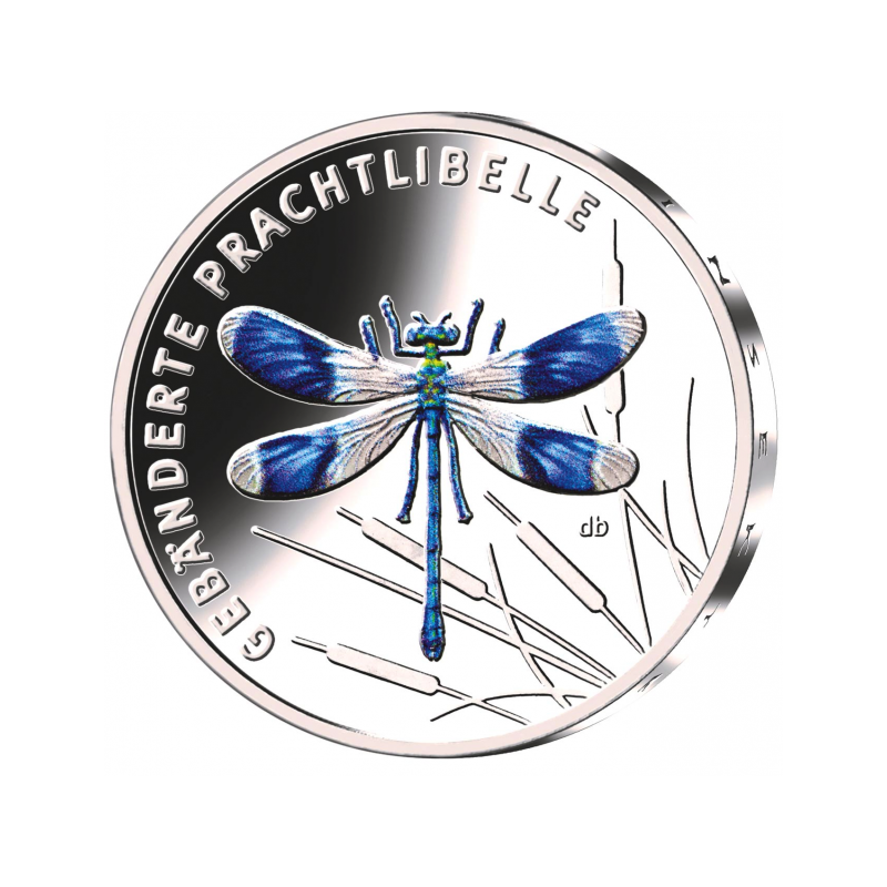 The €5 collectors’ coin “Banded demoiselle” is made of a cupronickel alloy. It weighs 9.68 g, measures 27.25 mm in diameter and will be available both in mint condition and with a proof-like finish. The mint condition coins will be brought into circulation at their face value (€5). The collector quality coins with a proof-like finish will be higher than their face value and will be issued by the Münze Deutschland (Germany’s official sales agency for collector coins).