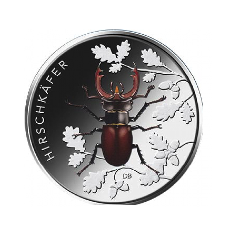 The coin motif, designed by the artist Detlef Behr from Cologne, shows an ideal male stag beetle in the style of a precise scientific illustration, in which all morphological details are correctly worked out. The typical black-brown coloring shows the beetle and its characteristic feature, the enlarged upper jaw (Mandibles), effectively emphasized. Idealized oak leaves and acorns in the background provide a subtle reference to the beetle's habitat and allude to the great importance of oak trees for the development of the larvae. The sans-serif lettering on the left edge of the coin forms a part of the composition balanced counterweight to the motif. The value side is identical for all coins in the series. The design, designed by artist Andre Witting from Berlin, impresses with a dignified yet dynamic representation of the federal eagle.