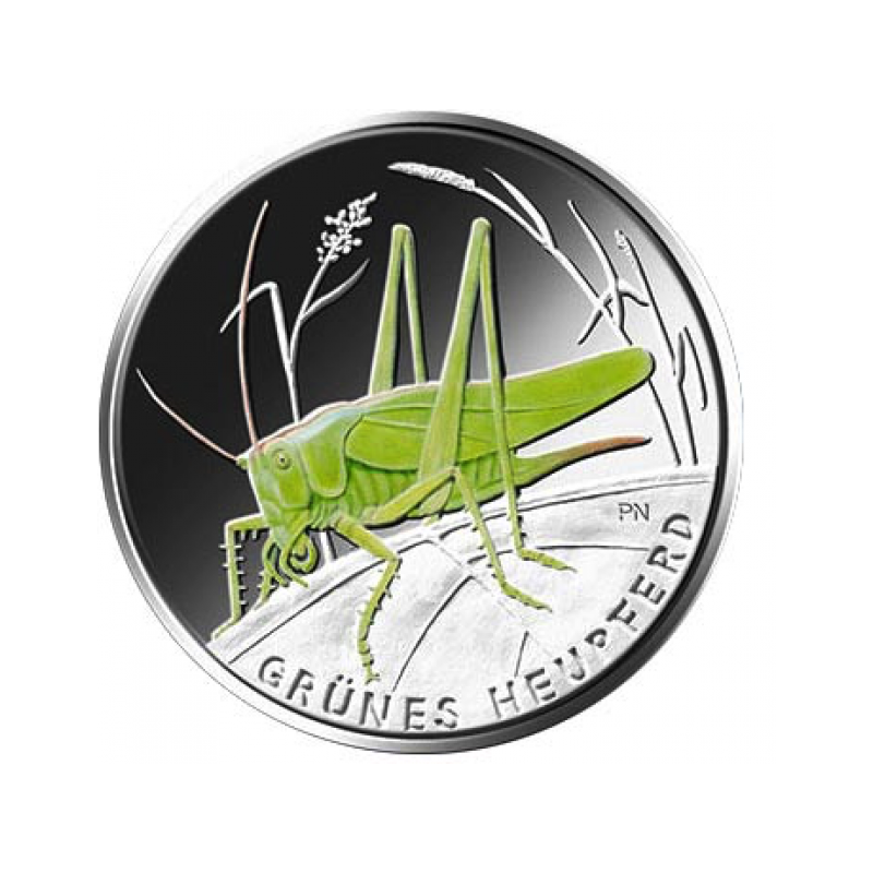 The German government has decided to mint a €5 collectors’ coin entitled “Great green bush-cricket", to be issed at 7 March 2024. It is the sixth coin issued as part of the “Wonderful world of insects” series, which will see a total of nine coins with partially coloured motifs issued over the period 2022-24. The series is intended to bring into focus – especially in light of current developments (insect extinction) – a special group of animals that make up a significant part of our natural heritage.