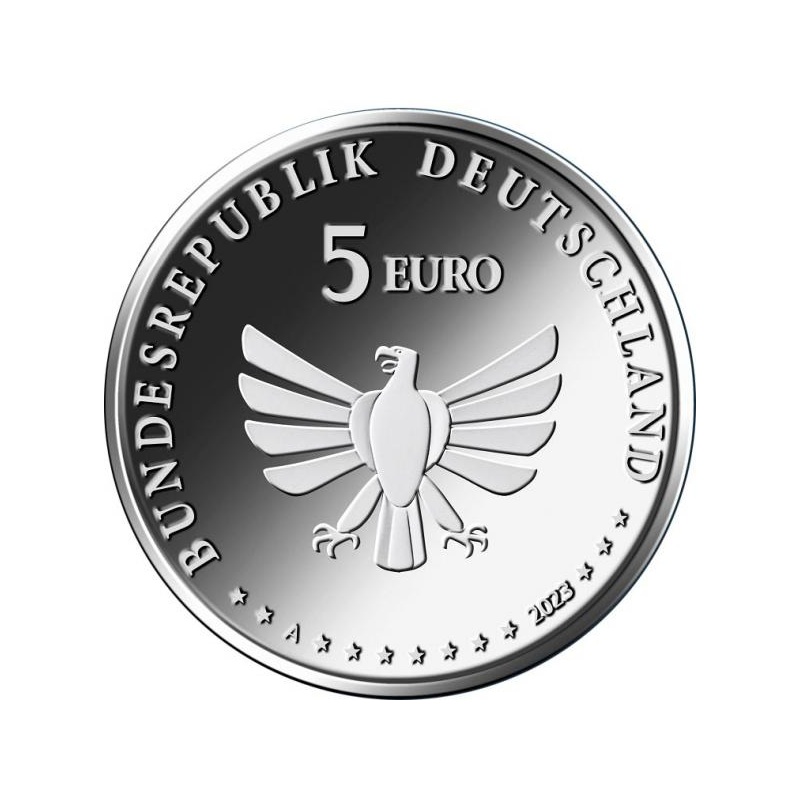 The reverse, which will be used for all coins in the series, features an eagle, the words “BUNDESREPUBLIK DEUTSCHLAND”, the value and denomination, the year 2023, the twelve stars of Europe and the letter “D” for the State Mint of Munich.