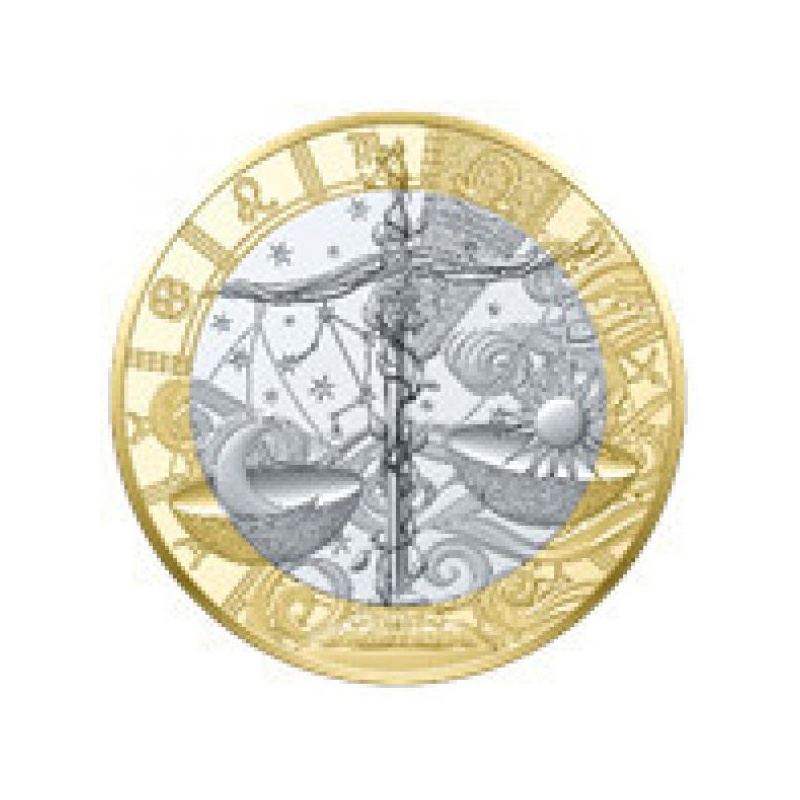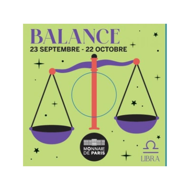 The wheel of the zodiac signs is engraved on the coin's gold-colored crown. One sign stands out from the background because it is larger than the others and has a sandblasted background that differs from the others. It is the symbol of Libra. Part of the wheel is hidden by spirals of mist, in reference to air, the element of this sign. At the very center of the design stands a balance. Its column, surrounded by ivy, resembles a sword, an attribute of Justice, to which it is also associated. Its pans seem slightly weightless as they weigh the sun on one side and a crescent moon on the other. In the background, the constellation Libra is outlined against a starry sky.