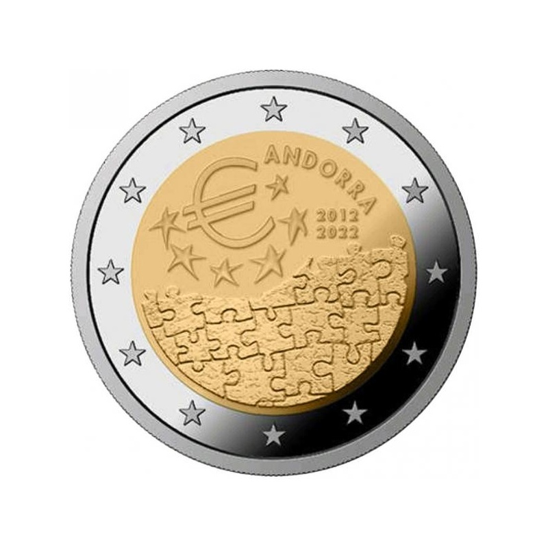 Kirjeldus: kujunduse alumises osas on kujutatud eri kujuga ja suurusega pusletükid, mis sümboliseerivad Andorra Vürstiriiki ja Euroopa Liitu kuuluvaid riike. Kujunduse ülemises osas on Euroopa ühisraha sümbolit ümbritsevad tähed, mis näitavad, et nad kõik on osa euro universumist. Nende kõrval on mündi käibele laskva riigi nimi „ANDORRA” ja aastapäevad 2012 ja 2022. Mündi välisringil on kujutatud Euroopa Liidu lipu 12 tähte.