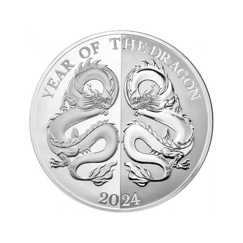 Draakoni aasta algab 10. veebruaril 2024. Hiina elemenditeoorias seostatakse iga sodiaagimärki ühega viiest elemendist: metall, puit, vesi, tuli ja maa ning iga element ilmub 60-aastases tsüklis. 2024. aasta tähistab puidudraakoni aastat. Öeldakse, et sel aastal sündinud inimesed on kirglikud, julged ja ambitsioonikad. Neile meeldib olla kontrolli all ja olla tähelepanu keskpunktis. Sellel hämmastaval 65 mm 1 untsi puhtast hõbemündil on peegelpildis dünaamiline draakoni kujutis. Münt on valmistatud peegelläikes parimas proof kvaliteedis, mille ühel küljel on draakon, millel on kõrgelt poleeritud proovilaud, teisel pool mattlaud ja poleeritud draakon. Nagu iga eelmisete sama kollektsiooni müntide puhul, vermitakse ainult 500 münti. Need on esimesed mündid selles seerias, millel on kuningas Charles III profiil.