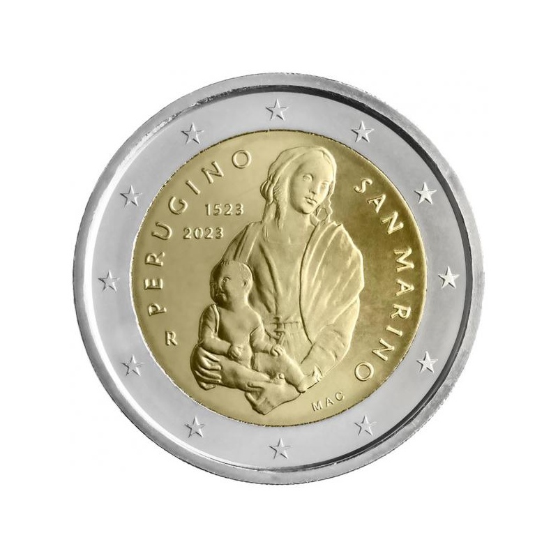 Kirjeldus: kujunduses on kesksel kohal Firenze Uffizi galeriis oleval Perugino maalil „Madonna lapse, püha Sebastianuse ja Ristija Johannesega” kujutatud neitsi Maarja koos oma lapse Jeesusega. Vasakul pool on kiri „PERUGINO”, aastaarvud 1523 ja 2023 ning rahapaja tunnus R. Paremal pool on käibele laskva riigi nimi „SAN MARINO” ja all paremal on autori Maria Angela Cassoli initsiaalid MAC. Mündi välisringil on kujutatud Euroopa Liidu lipu 12 tähte.