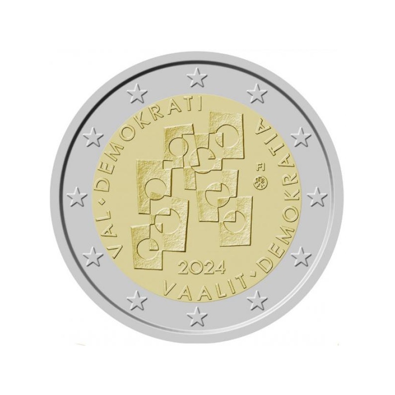 Kirjeldus: mündil on stiliseeritud hääletussedelid. Hääletussedelid on moodustatud ringidest ja ristkülikutest. Motiiv on abstraktne, kuid siiski äratuntav. Hääletussedeleid on kaheksa ja need varjavad üksteist osaliselt, moodustades kattuvate sedelite kokkulangemiskohtades väiksemaid geomeetrilisi kujutisi. Mündi allosas on aastaarv 2024. Mündi paremal pool veidi keskjoonest kõrgemal on tähend FI. Mündi paremal pool on poolringis tekst „VAALIT ♦ DEMOKRATIA”. Mündi vasemal pool on poolringis tekst „VAL ♦ DEMOKRATI”. Mündi välisringil on kujutatud Euroopa Liidu lipu 12 tähte.