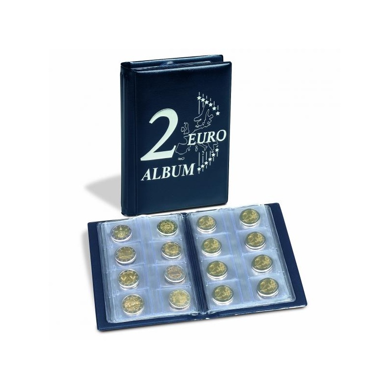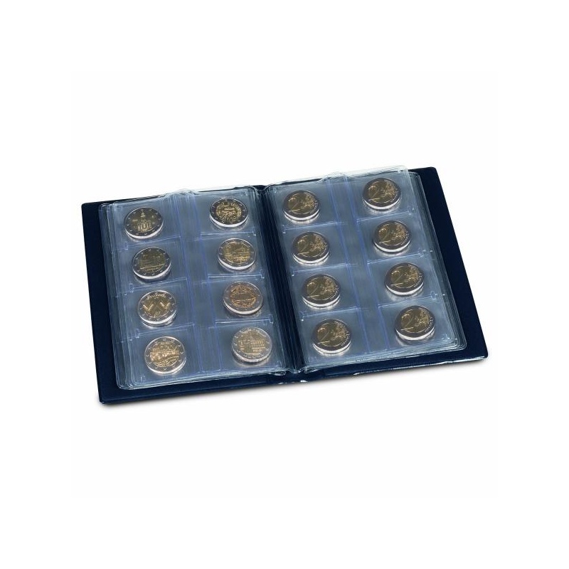 See käepärane taskualbum mahutab 48 2-eurost münti ning sobib ideaalselt reisimile kaasa võtmiseks.. 6 mündilehte, igas 8 kohta 2-eurosele mündile, vastupidavate kristallselgete vahelehtedega (keemiliste pehmendajatevabad). Polsterdatud tumesinine kaas ja stiilne hõbedane reljeeftrükk.