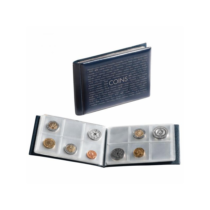 Mündialbum, mis sisaldab 8 lehte, igaühel ruumi 6 mündile läbimõõduga kuni 33 mm.. Hõbedase reljeeftrükiga „COINS” (MÜNDID) polsterdatud kaanel. Kogumõõt: 150 x 105 mm. Ideaalne kollektsiooni transportimiseks ja Keemilistest pehmendajatest vaba, vastupidavast PVC-st mündilehed.