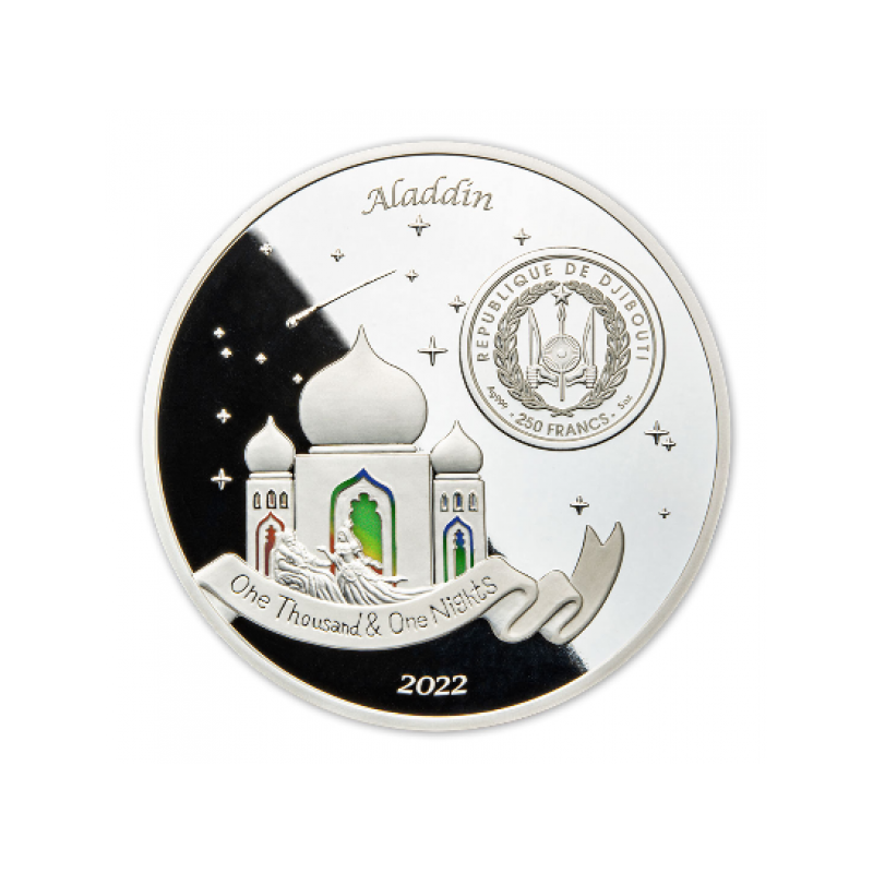 Tuhat ja üks ööd. Aladdin. Djibouti 250 Fr 2022.a hôbemünt, hologrammiga, 5 oz