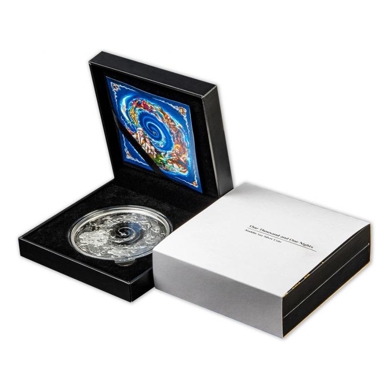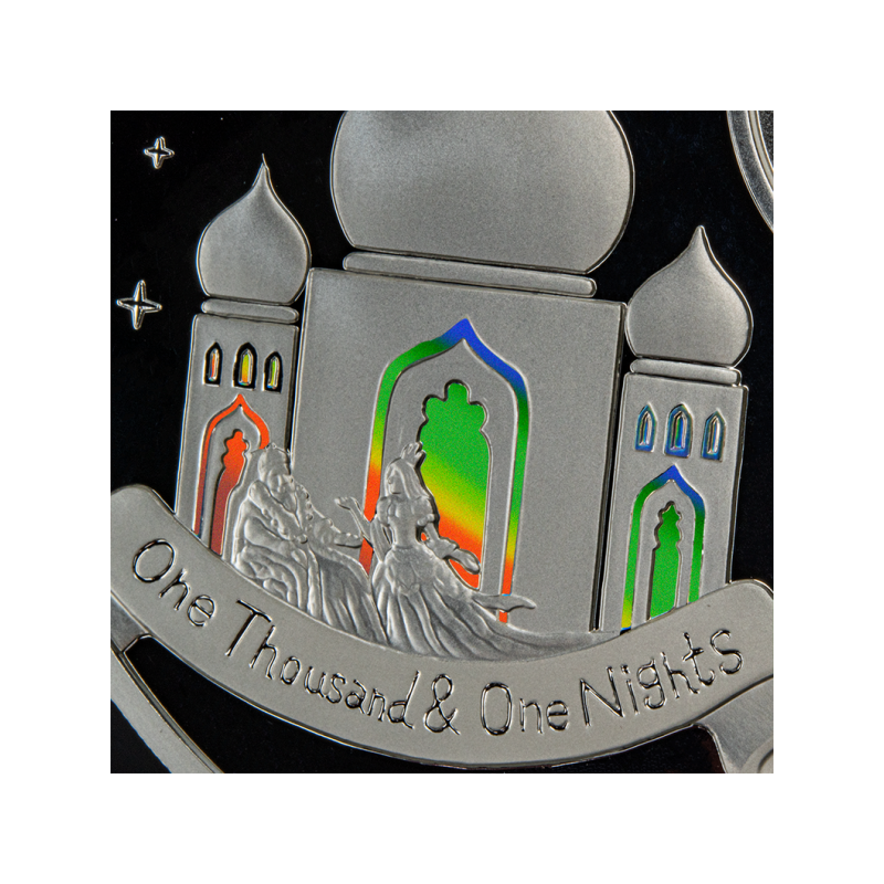 See imeline münt on loodud originaalne käsitsi joonistatud kunstiteose pôhjal, Detailirohke münt on inspireeritud kuulsast Aladdini loost.5-untsisel puhtast hôbedast mündil on efektne hologramm. Elegantses kinkepakendis mündil on kaasas autentsussertifikaat. Piiratud tiraaž, ainult 1001 tükki kogu maailmas.