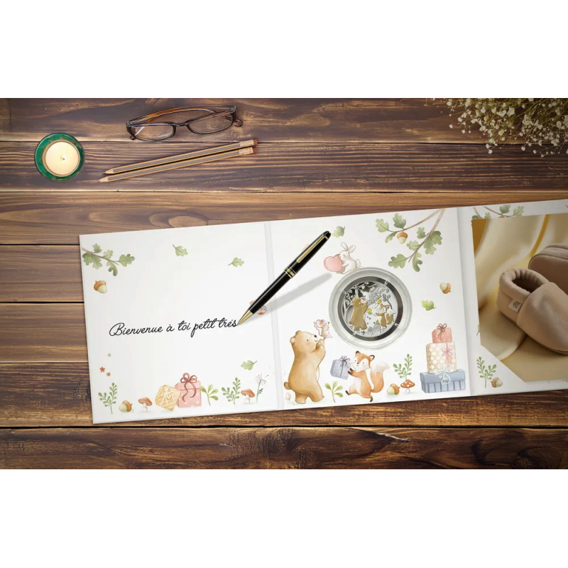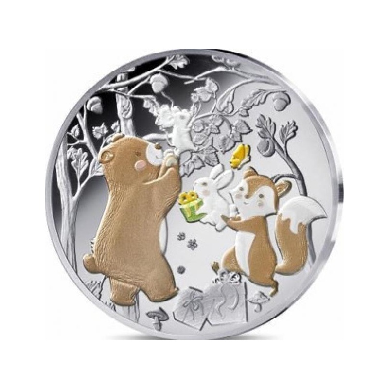 Tämän värillisen 5€ hopearahan, tälle kokoelmalle kehitetyn uuden nimellisarvon, kääntöpuolella koko tiimi on koottu juhlimaan iloista tapahtumaa: vastasyntyneen vauvan saapumista metsään! Jokainen on tuonut lahjoja ja iloa tähän upeaan päivään. Karhu, kettu, pupu ja hiiri herätetään henkiin valikoivalla läpinäkyvällä musteella.
