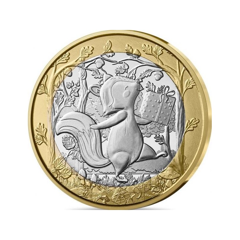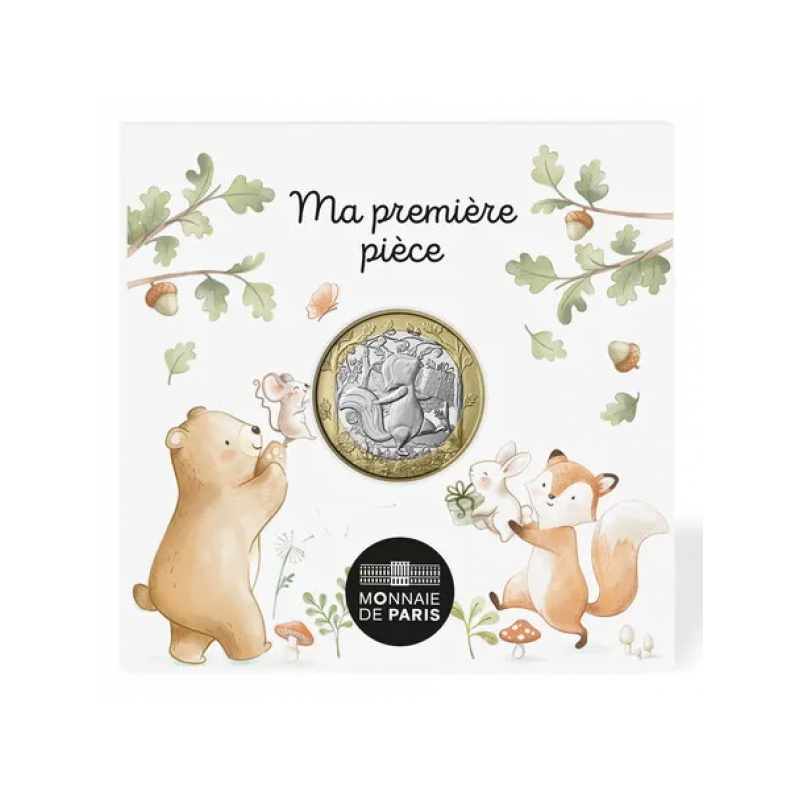 Tämän värillisen 5€ hopearahan, tälle kokoelmalle kehitetyn uuden nimellisarvon, kääntöpuolella koko tiimi on koottu juhlimaan iloista tapahtumaa: vastasyntyneen vauvan saapumista metsään! Jokainen on tuonut lahjoja ja iloa tähän upeaan päivään. Karhu, kettu, pupu ja hiiri herätetään henkiin valikoivalla läpinäkyvällä musteella.