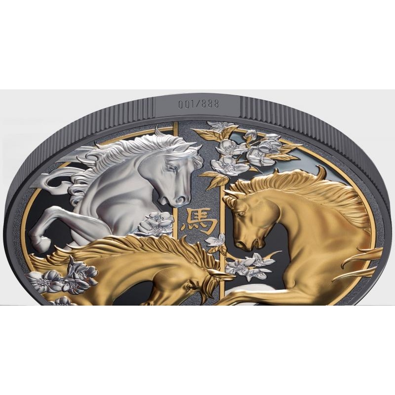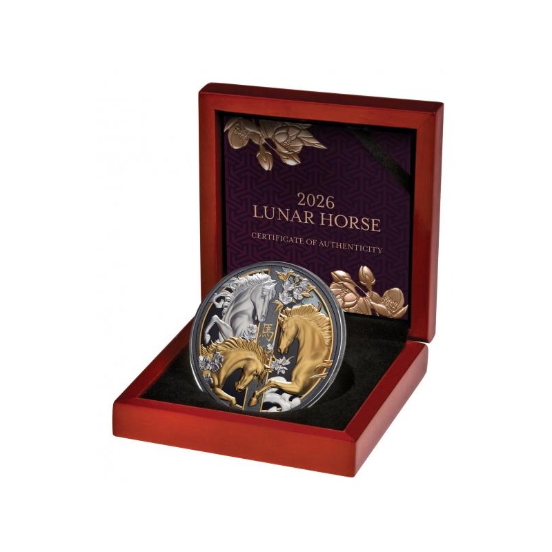 Tämä rajoitetun erän 1 dollarin ja 1 unssin hopeinen Proof-kolikko on valmistettu 99,9 % puhtaasta hopeasta virheettömään Proof-laatuun. Kolikossa on monimutkainen ja eloisa hevosaihe, joka on saanut inspiraationsa kiinalaisesta kiinalaisen uudenvuoden perinteestä. Kolikkoa on saatavilla maailmanlaajuisesti vain 888 kappaletta, ja jokainen kolikko on puisessa kotelossa, jossa on numeroitu aitoustodistus – täydellinen muistoesine tai lahja hevosen vuonna syntyneelle.