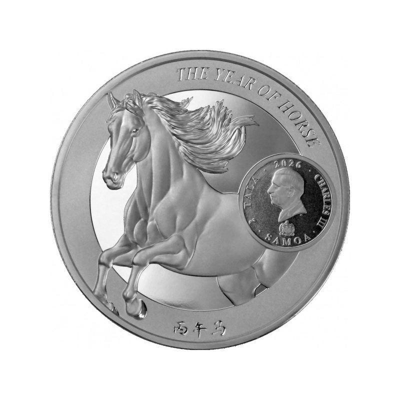 Hevosen vuosi 2026. & Akashagarbha - Samoa 2$ 2026.v 99,9% hopearaha 31,1 g