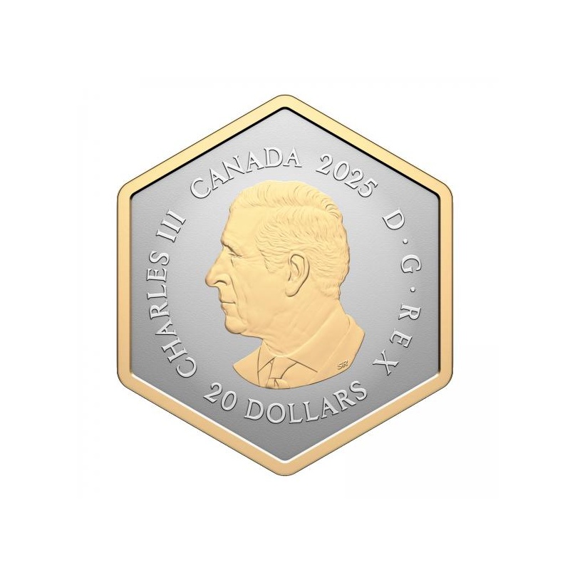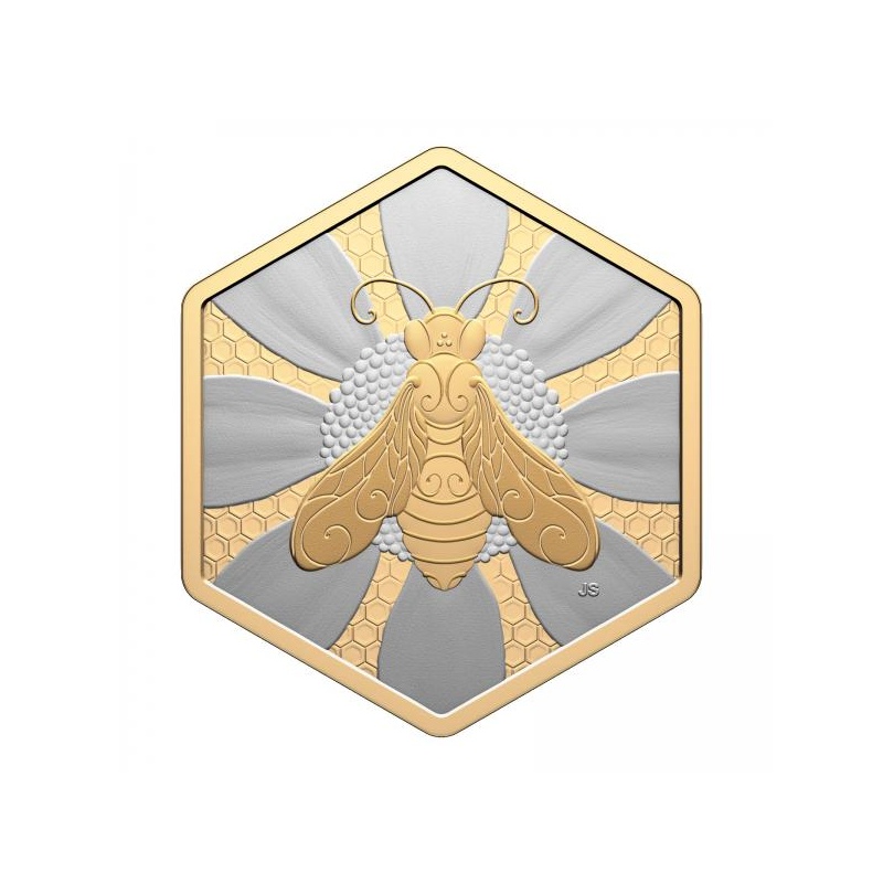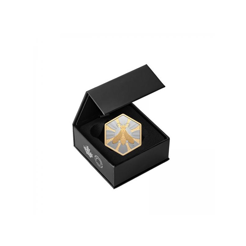 Tehokkaana sekä vaistonvaraisesti että rakenteensa puolesta tunnettu hunajamehiläinen ja sen kenno on kauniisti koristeltu keltaisella kullalla tässä 99,99 % puhtaasta hopeasta valmistetussa rahassa, jossa sopivasti on suosittu kuusikulmainen muoto, joka jäljittelee hunajakennosolun luonnollista rakennetta, jota pidetään laajalti luonnon täydellisenä rakenteena.