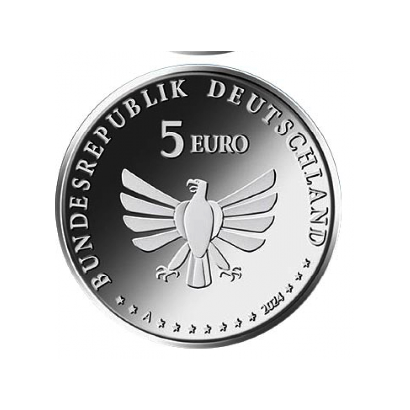 Kääntöpuolella, jota käytetään kaikissa sarjan kolikoissa, on kotka, sanat "BUNDESREPUBLIK DEUTSCHLAND", arvo ja nimellisarvo, vuosi 2024, Euroopan kaksitoista tähteä ja kirjain "A" valtion rahapajalle. Berliini.