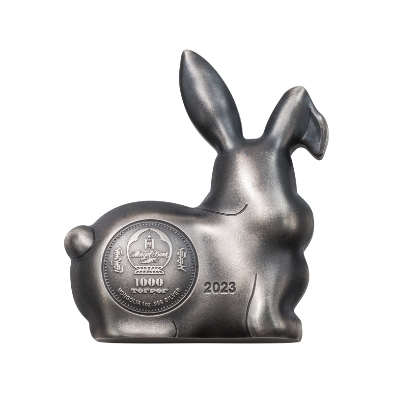 Jäniksen vuosi 2023 - Mongolia 500 Tugrik 1 unssi 99,9% 3D hopearaha, antiikkipatinointi
