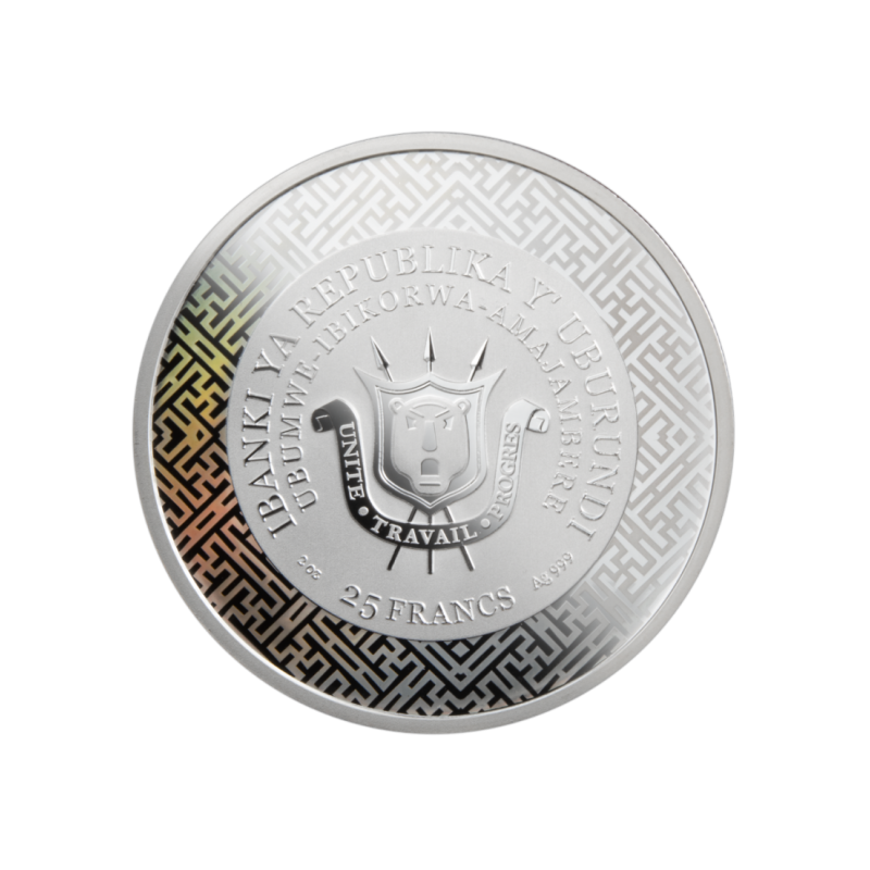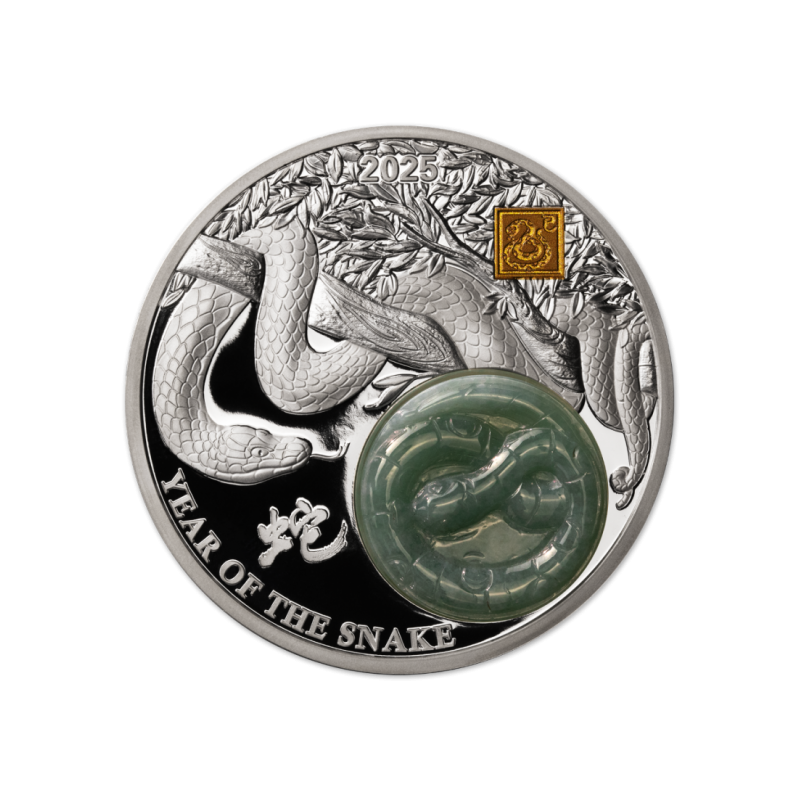 Käärmen vuosi 2025 - Burundi 25. Franki 99,9% hopearaha, jadeiitti ja kultaus, 2 unssi