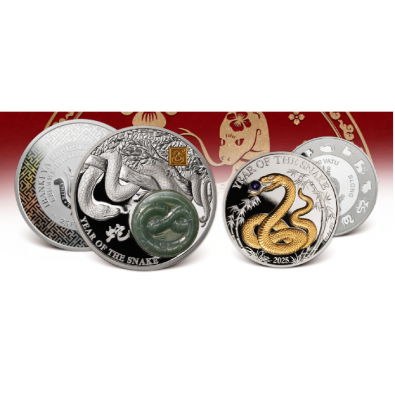Tämä kahden kolikon setti juhlistaa käärmeen vuotta, ja se on lupaava ja perinteinen lahja tai keräilykohde kuukaudelle. Käärmevuonna syntyneiden ihmisten sanotaan olevan viisaita, rauhallisia ja tarkkaavaisia. Setissä on rauhallinen käärme, suotuisa bambu, hyveen symboli; ja kiinalainen kuukalenteri esitettiin pyöränä. Onnea ja menestystä vuodelle 2025.