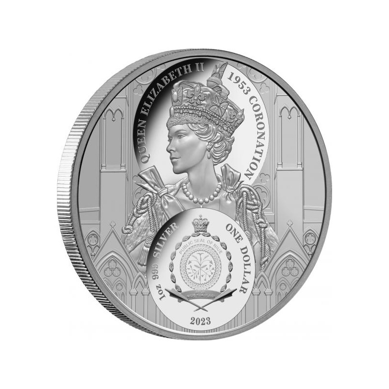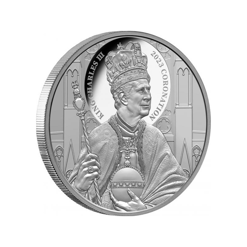 Kuningas Charles III kruunaus. Niue 1 $ 2023 99,9€ hopearaha, 31.1 g