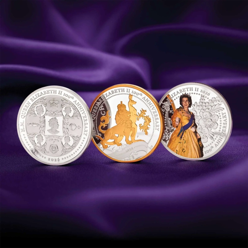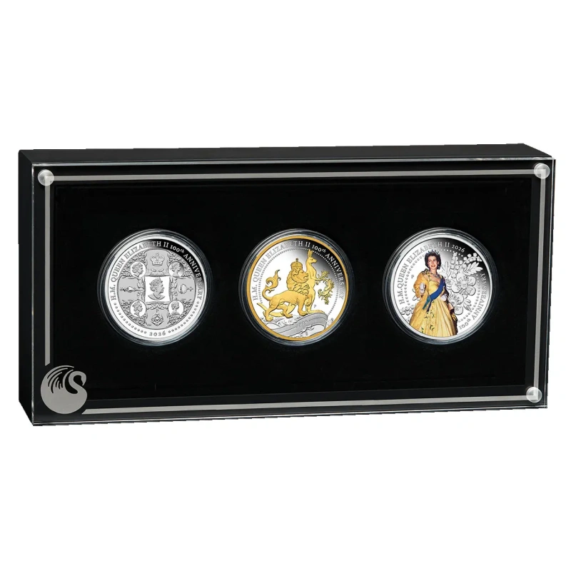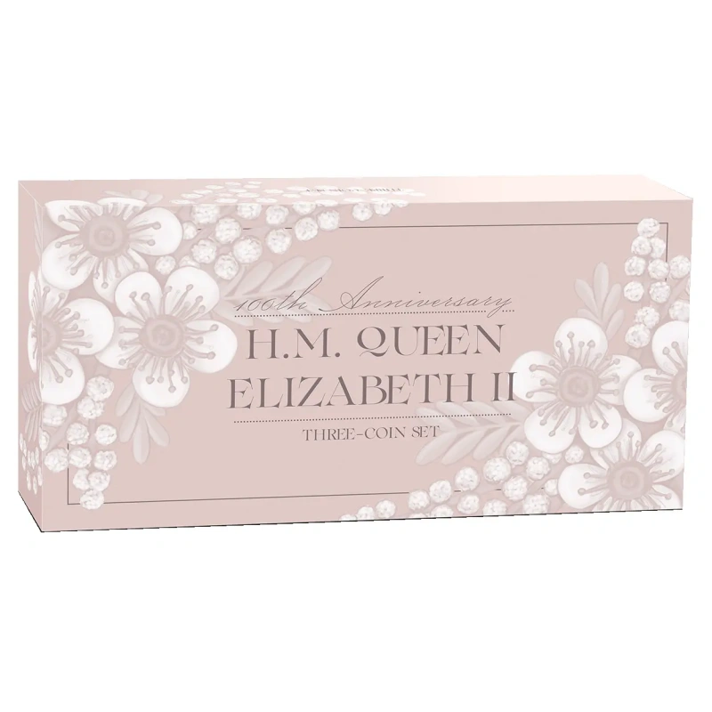 Hänen Majesteettinsa kuningatar Elisabet II:n satavuotisjuhlan kunniaksi tässä upeassa hoperahasetti sisältää kolme puhdasta hopeaa olevaa muistorahaa, joissa on monimutkaisia kuvioita ja erityisiä korostuskäsittelyjä.
