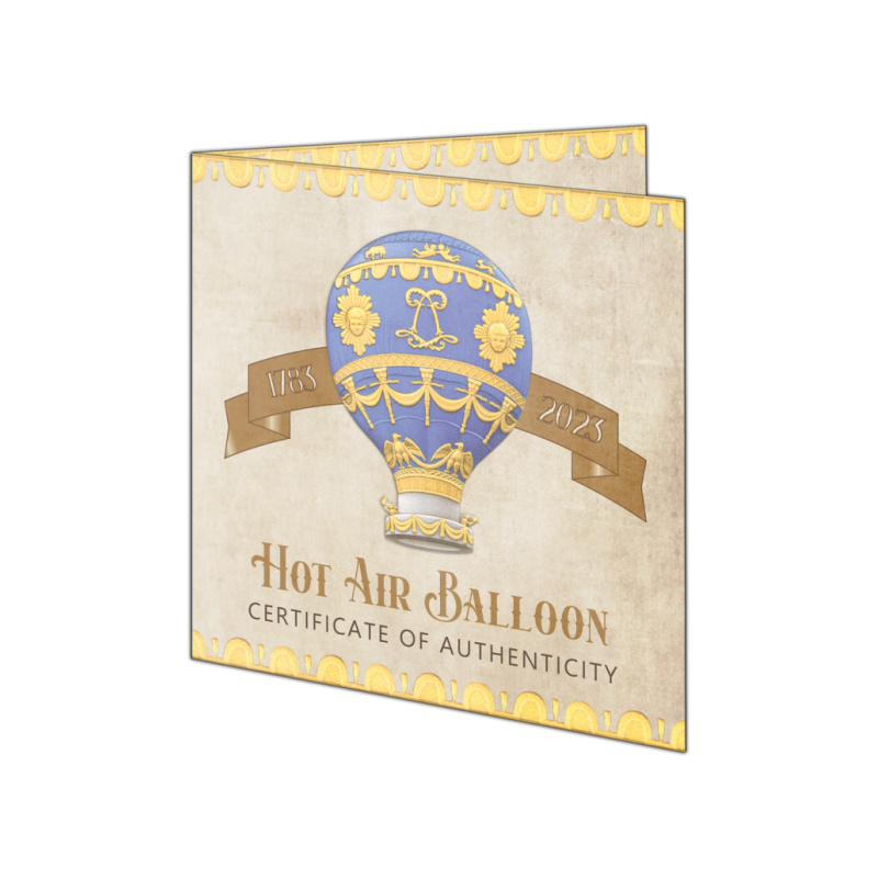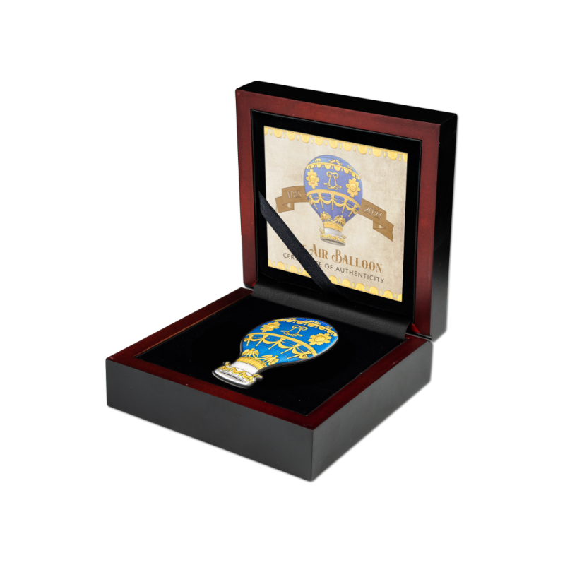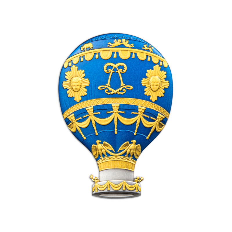 Tämä upea 2 unssin ilmapallon muotoinen kolikko, jossa on sininen metallilakka ja kultaprintti, on saanut inspiraationsa ensimmäisten kuumailmapallojen ulkonäöstä.