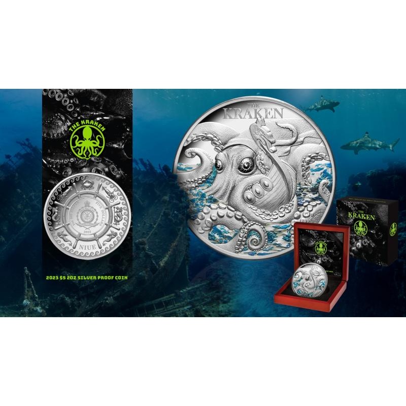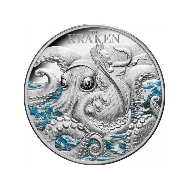 Myyttiset olennot - Kraken. Niue 5 $ 2023 99,9 % hopearaha 62,2 g