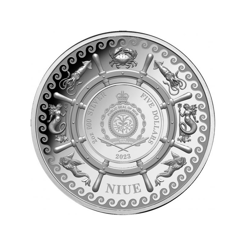 Vuoden 2023 5 dollarin Siren 2 unssin hopearaha on uusin merenkulkualan mestariteoksemme, juhlii myyttistä merisireeniä – tappavan kauneutta. Sireeni on peräisin antiikin kreikkalaisesta mytologiasta - pahasta viettelijästä, joka ottaa puoliksi naisen, puoliksi linnun muodon. Roomalainen runoilija Ovidius kirjoitti, että sireenit olivat aikoinaan Persefonen, jumalatar Demeterin tyttären, ihmiskumppaneita. Kun Hades, alamaailman jumala, varasti Persefonen, Demeter muutti sireenit linnuiksi rangaistuksena. Legenda Sireenistä, olennona, joka houkutteli merimiehiä kuolemaan laulunsa vastustamattoman suloisuudella, levisi edelleen Homeroksen teosten kautta, kun sankari Odysseus kohtasi heidät pitkällä matkallaan takaisin Ithakaan. Nykyaikana Sireeniä kuvataan usein upeana, mutta tappavana merenneitona – pohjimmiltaan houkuttelevana kiusaajana, joka kykenee houkuttelemaan paatuneita merimiehiä kuolemaan hypnoottisella laulullaan. Juuri tämä haluttu syvän asukas on kuvattu loistavasti tämän näyttävästi osuneen Niuen laillisen maksuvälineen hopearahan kääntöpuolella.