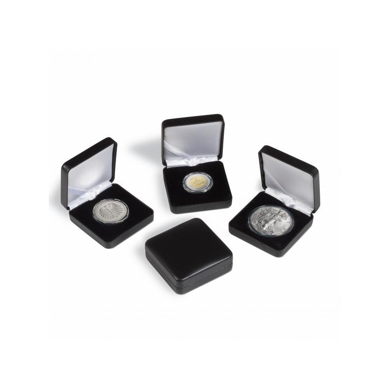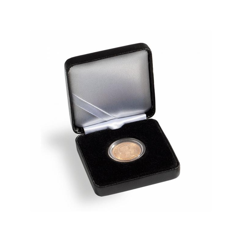 Elegantne mustakunstnahaga polsterdatud kinkekarp mündile kapslis 35-37 mm või ilma kaplsita 42 mm