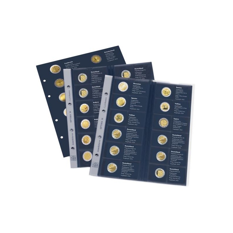 OPTIMA-klassikkoalbumi kaikkien* eurooppalaisten 2 euron erikoiskolikoiden säilytykseen. Kerää 2 euron erikoiskolikot kahteen laajennettavaan kansioon. Teemana "2 euron yhteiskolikot" albumi Sisältää kolikkoarkkeja ja kuvitettuja sivuja sekä tärkeää taustatietoa julkaisuvuodesta, kolikon aiheesta ja julkaisuhetkestä. Pidetään ajan tasalla vuosittain julkaistavien liitteiden ansiosta. Albumin kokonaiskoko: 245 x 270 mm; suojakotelon kokonaiskoko: 250 x 280 x 60 mm.