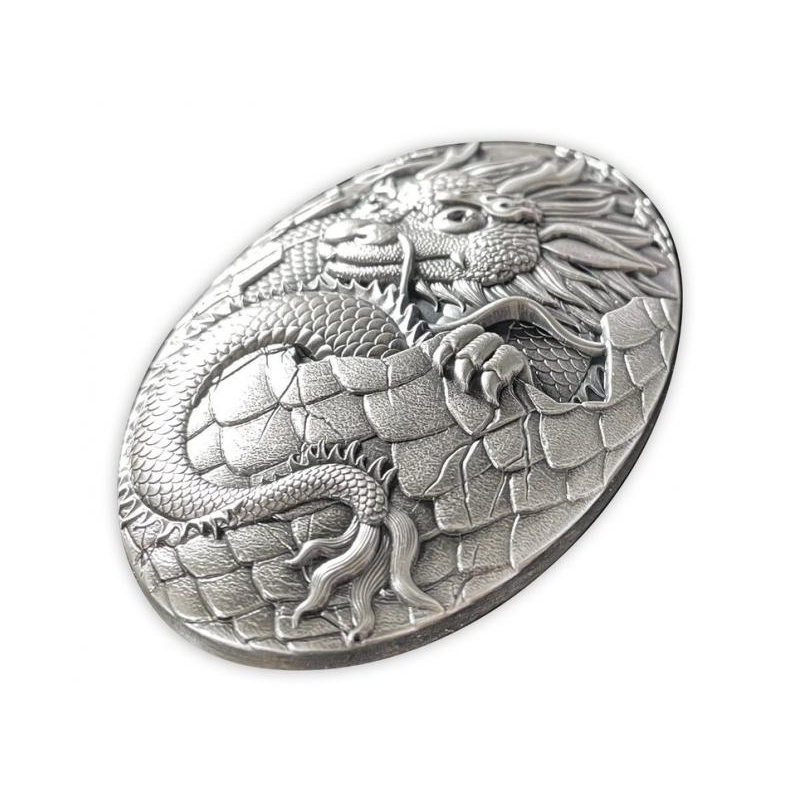 Tässä hämmästyttävässä 65 mm: n puhtaan 99,9% hopean rahassa on klassinen kuva lohikäärmäestä peilikuvan päällä, mikä on erinomainen esimerkki