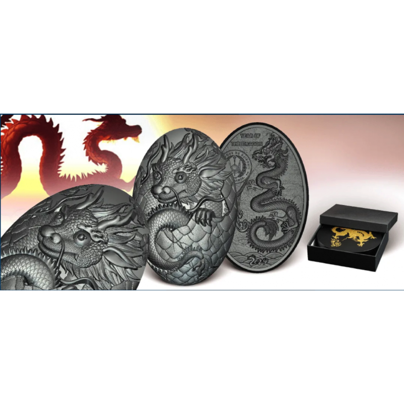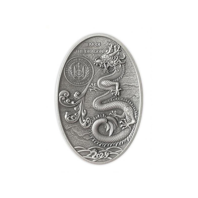 Runsautta, vaurautta ja onnea. Lohikäärme vuosi 2024- Djibouti 2024.v 250 Franki 99,9% hopearaha antiikkipatinointi, 5 unssi