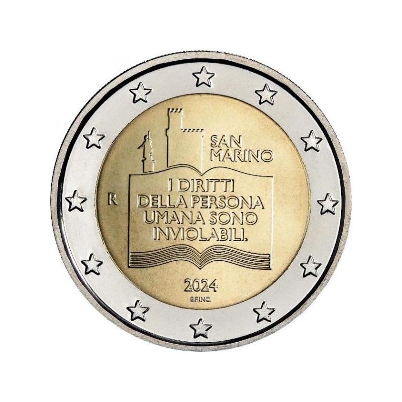 Kuvaus: Kolikon keskellä on avoin kirja, jossa on teksti ”I DIRITTI DELLA PERSONA UMANA SONO INVIOLABILI” (ihmisen oikeudet ovat loukkaamattomia) 8.7.1974 annetun lain nro 59 ”Julistus kansalaisten oikeuksista ja San Marinon oikeusjärjestyksen perusperiaatteista” pykälästä 5. Ylälaidassa on vapaudenpatsaan ja hallintorakennuksen siluetit sekä liikkeeseenlaskijamaan nimi ”SAN MARINO”. Vasemmalla on Rooman rahapajan tunnus ”R”. Alalaidassa on liikkeeseenlaskuvuosi ”2024” ja kaivertaja Emanuele Ferrettin nimikirjaimet ”E.F. INC.” Kolikon ulkorenkaalla ovat Euroopan unionin lipun 12 tähteä.