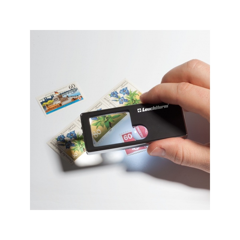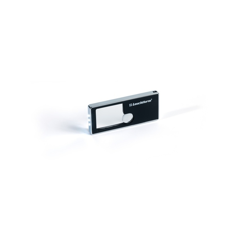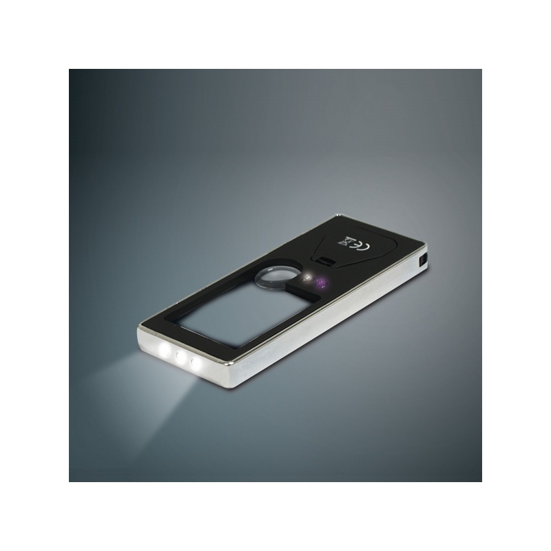 Monitoiminen suurennuslasi, jossa on 2,5-kertainen suurennus (suuri linssi) ja 10-kertainen suurennus (pieni linssi). Kaksi asfääristä akryylilasista valmistettua linssiä takaavat korkean kuvanlaadun. Suurennuslasin monikäyttöisyys takaa 3 erilaista valaistustoimintoa yhdessä laitteessa: 3 huipputeknistä LEDiä (taskulamppu), 1 pitkäaaltoinen UV-lamppu setelien havaitsemiseen sekä 1 valkoinen LED-valo, jolla voit tutkia kokoelmiasi myös huonoissa valaistusolosuhteissa. Linssien mitat: 30 x 37 mm (suuri) tai Ø 15 mm (pieni). Mukana irrotettava miniatyyrikuulakärkikynä muistiinpanojen tekemiseen sekä keinonahkainen suojakotelo. Musta muovikotelo. Paristokäyttöinen, 3 x LR927. Kokonaismitat (L/P/K): 38 x 91 x 8 mm