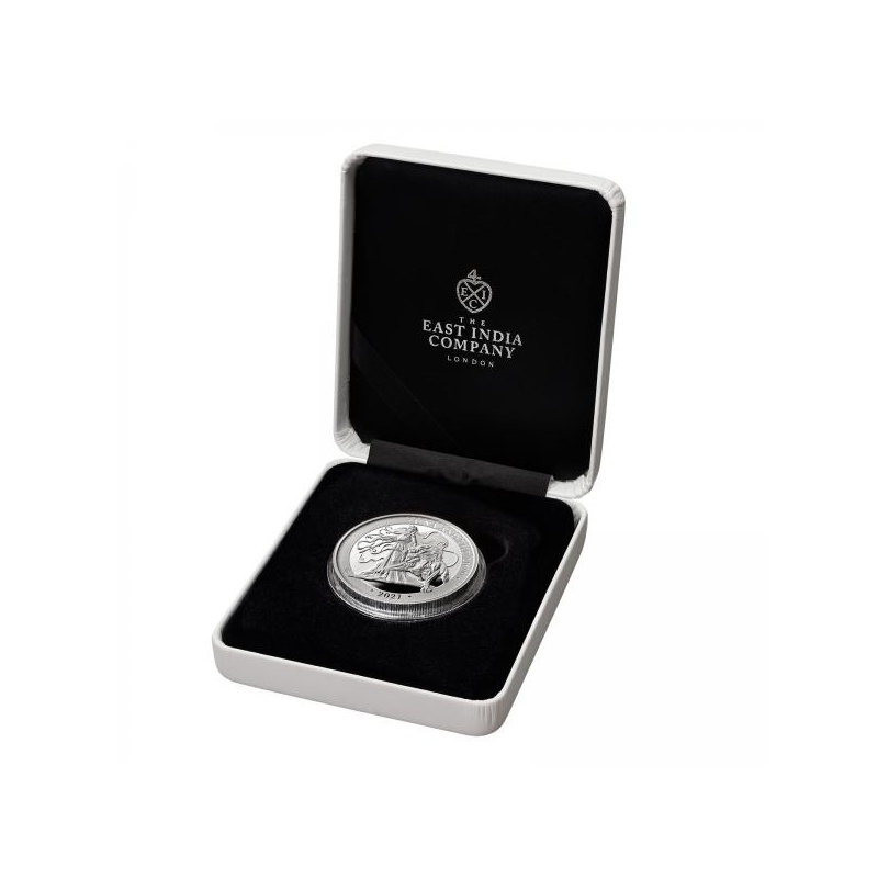 The East India Company on suunnittelenut Kiinan kauppadollarin vuodelle 2021, upea Proof-laatune. hopearaha joka korostaa jokaista yksityiskohtaa uudesta suunnittelusta, jossa on mahtava lohikäärme, joka ympäröi maapalloa.
