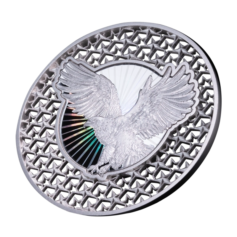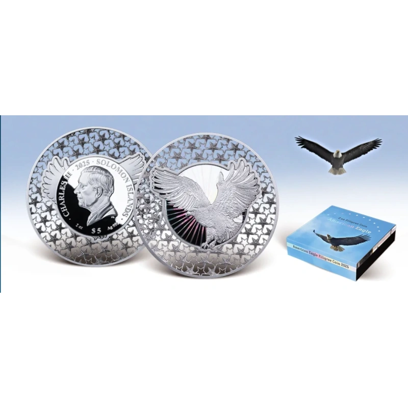 «Американский орел» - Соломоновы Острова, 5$, 2025 г. 99,9% серебряная монета в технике филигрань. 2 унции.