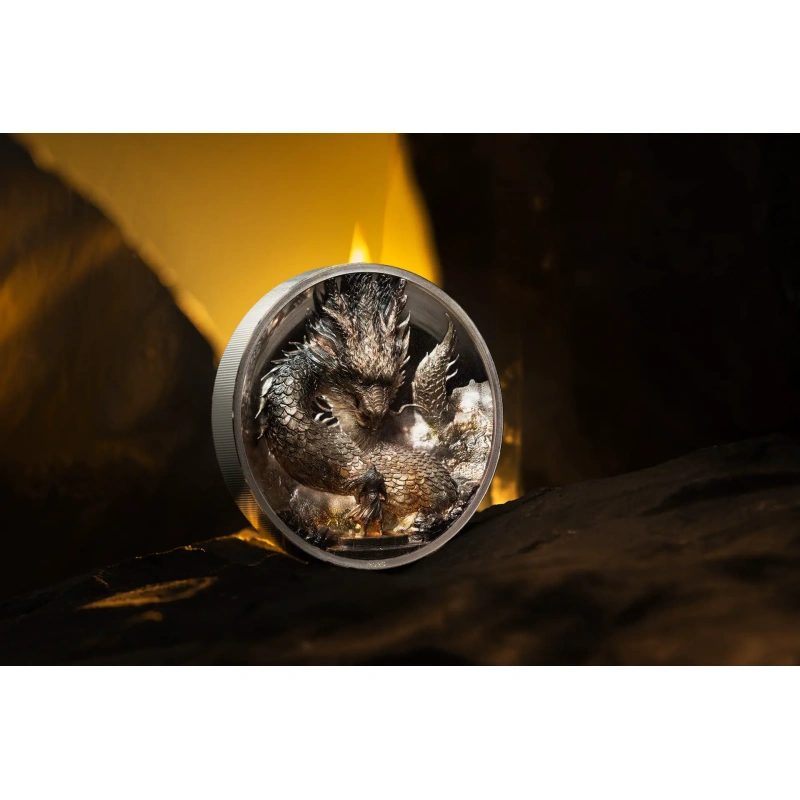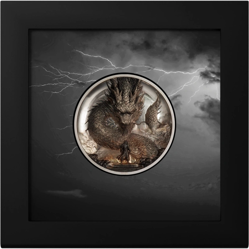 Оба персонажа впечатляюще изображены на 3-унцовой монете в сверхвысоком рельефе. Вогнутая форма создает впечатление, будто могучий дракон вот-вот выпрыгнет из монеты. Изысканная цветовая гамма на поверхности монеты создает атмосферу огня и грома, играя с силами природы.