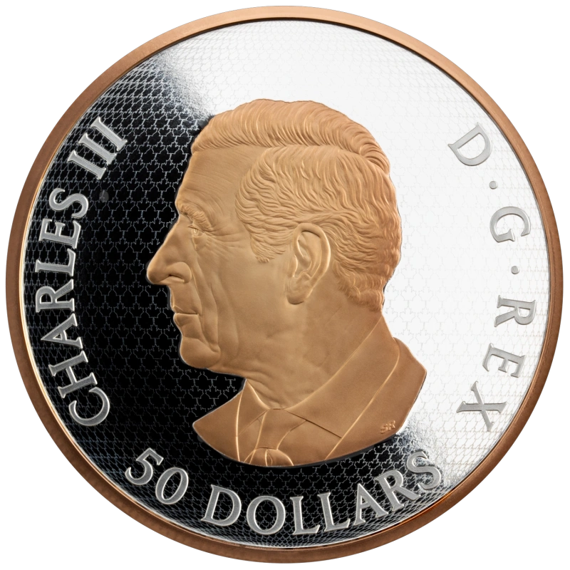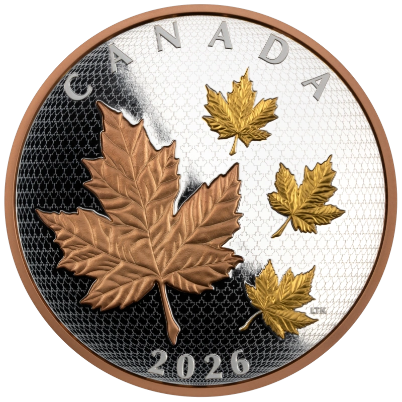Эта впечатляющая серебряная монета весом 5 унций демонстрирует культовый канадский кленовый лист в динамичной композиции, подчеркнутой покрытием из розового и желтого золота для исключительной глубины и контраста.