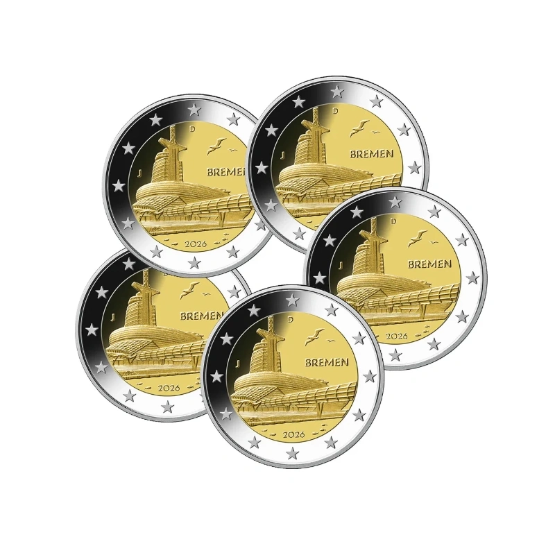 2 € юбилейная монета 2026 г. Германия - Бремен, музей климатических зон в г.Бремерхафен.(Набор из 5 монет: A, G, D, F, J)..
